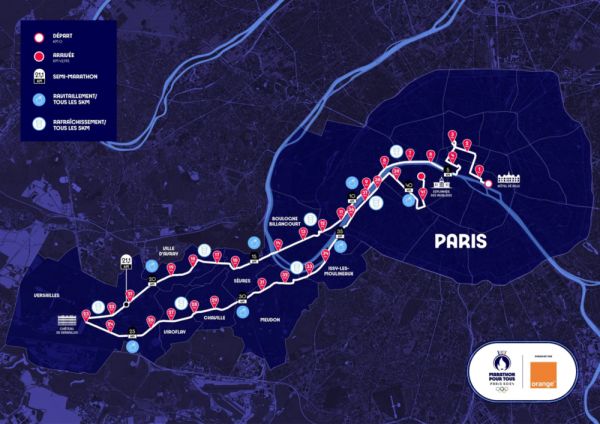 和专业选手一样,参加全程马拉松的大众选手也将从塞纳河边的巴黎市政厅出发,途经巴黎歌剧院、杜乐丽花园、卢浮宫、协和广场等景点,一直跑到20公里外的凡尔赛宫。返程线路会经过埃菲尔铁塔,终点设在荣军院。赛道上坡路段最大坡度为13.5%,下坡路段坡度为-13.4%,全程爬坡总高度438米。