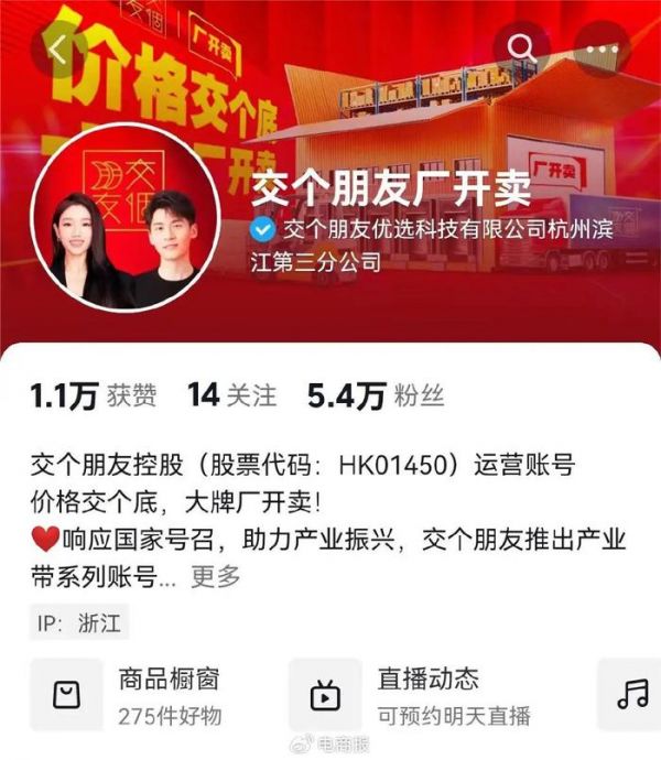 据了解,去年双11期间,交个朋友在抖音、淘宝、京东三平台总GMV突破24.83亿。截至目前,交个朋友旗下已在抖音、淘宝、京东等多个电商平台拥有超过30个直播间,全网粉丝数超5000万,合作品牌方超11000家。