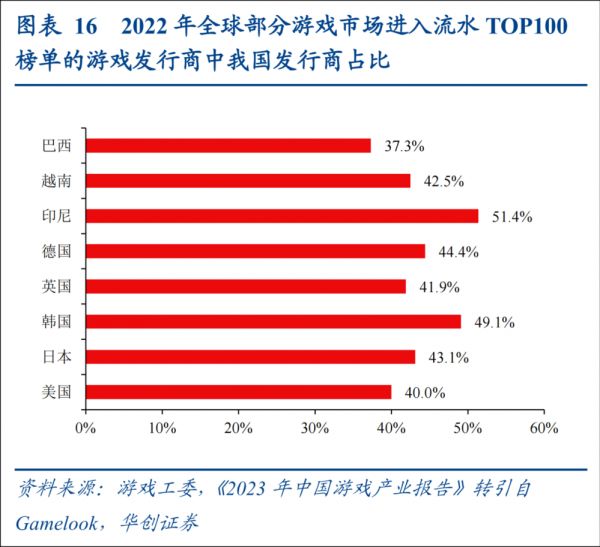 在主要海外游戏市场的头部产品中,平均40%的游戏发行商均来自中国。中国游戏产业真正成为了在全球具备显著竞争力的优势产业,并且在之后还有广阔的发展空间等待各个游戏厂商去发掘。