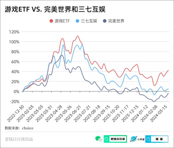 我们将游戏ETF(159869)与国内游戏公司两大龙头三七互娱和完美世界过去的走势放在一起对比来看,从2023年1月1日至2024年3月22日,游戏ETF收益为42%,而同期三七互娱为5%,完美世界为-4%。
