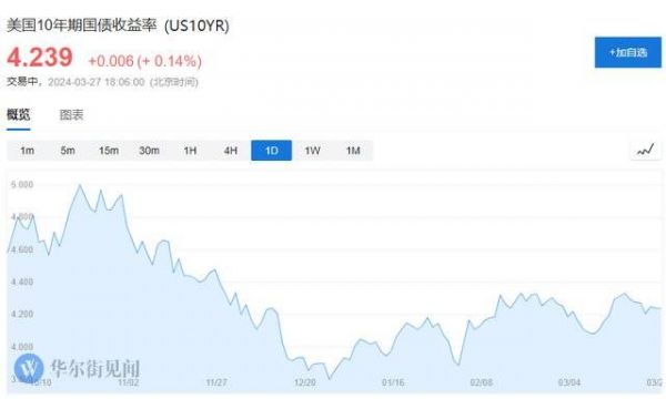3月26日,美债收益率全线收跌,对利率较为敏感的2年期美债收益率跌3.5个基点报4.603%,10年期美债收益率3月27日(北京时间)报4.239%,较去年5%的高点大幅回落。
