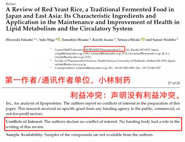 小林制药的研究者发布的红曲米功效研究论文,在结尾居然声明“没有利益冲突”| 参考论文[7]