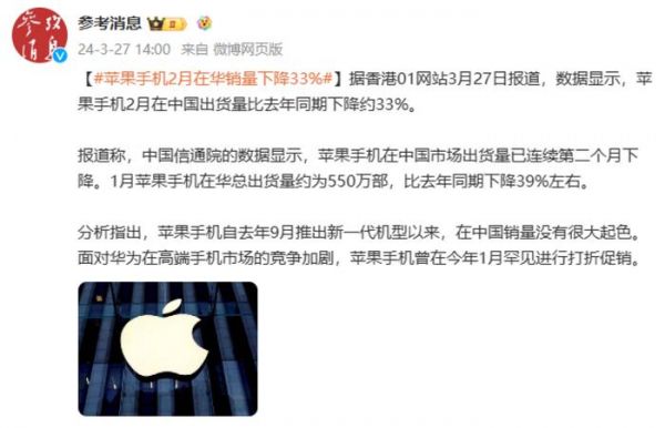 而最新的一则报道则显示,苹果手机2月在中国市场的出货量比去年同期下降了约33%,今年以来苹果已经连续两个月大幅下滑了,情况不容乐观。
