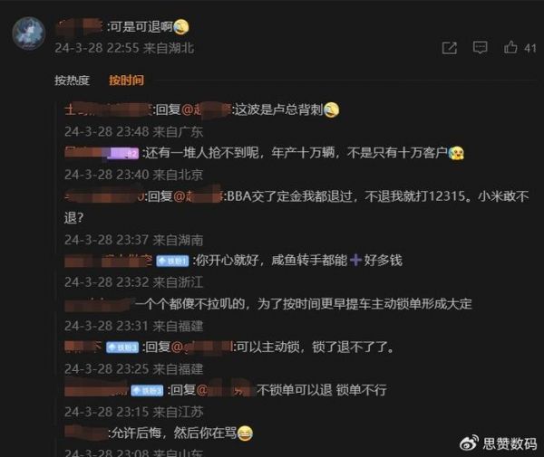 但是很快又有网友不服了,气冲冲说:“BBA交了定金我都退过,不退我就打12315。小米敢不退?”说实话,这多多少少有点杠着上了,可能会给人一种占着茅坑不拉屎的感觉哈,不知道对此你怎么看呢?