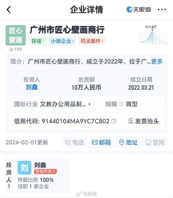 天眼查App显示,广州市匠心壁画商行成立于2022年3月21日,投资人为刘鑫,注册资本为10万。其主要经营许可项目涵盖文教、工美、体育和娱乐用品制造等多个领域。