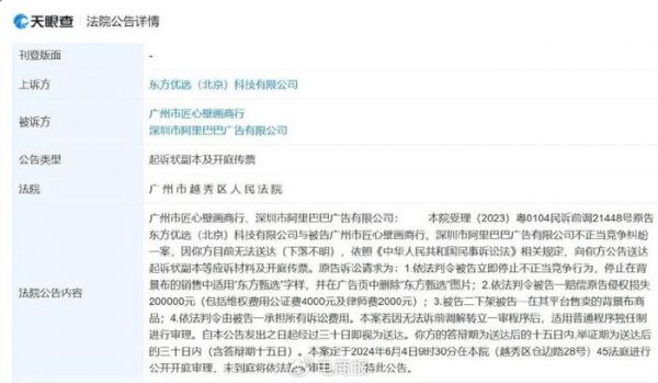 日前,由于广州市匠心壁画商行下落不明,广州市越秀区人民法院向其公告送达东方优选与该公司及阿里广告不正当竞争纠纷案件起诉状副本及开庭传票。