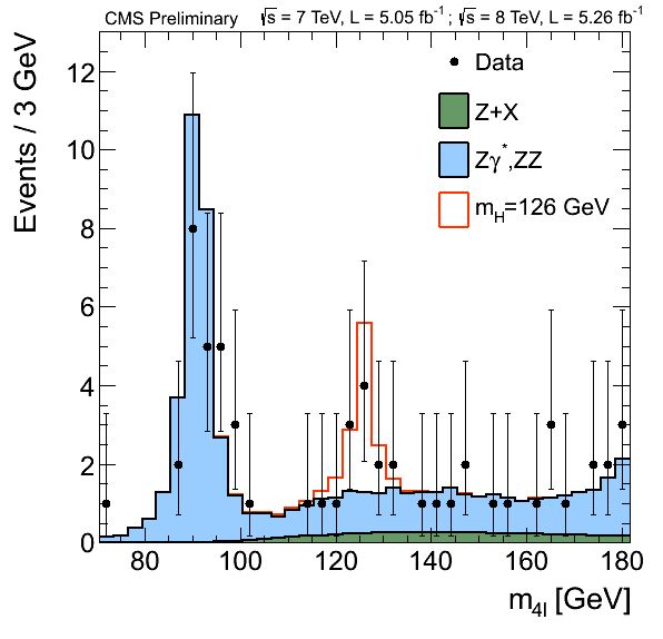 以LHC上的探测器CMS为例,每秒CMS都会存储几个Gb的数据,一年运行下来,累积存储了十几个Pb。借用LHC的官方宣传,这些数据相当于1千万张DVD,如果把它们堆起来,将会有12千米高。在这海量的数据中,实验学家们最后发现了多少希格斯玻色子呢?下面这张图片来自于当年的发布会,你用几秒就能数出“黄金道”四轻子末态中的数据个数,能被称作疑似希格斯玻色子的事件大概只有14个,其中一半还是偷偷混进来的“背景”——就是那些并非希格斯玻色子,但却被选中的事件。