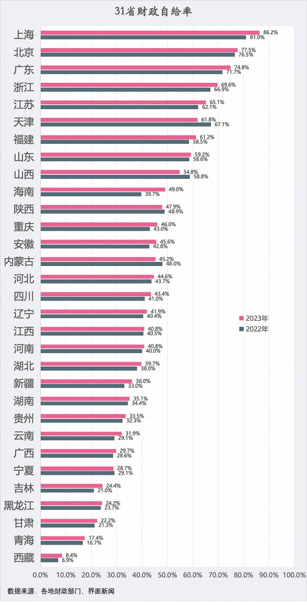 以地方一般预算收入/支出来衡量,在全国,超过一半省份财政自给率不到50%,对转移支付的依赖可见一斑。