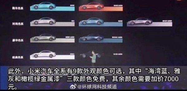 雷军回应小米汽车颜色加价问题:最好看的3种颜色免费。