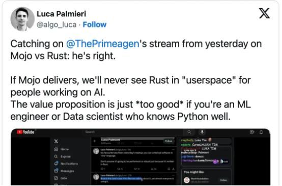另一方面,Mojo 团队对 Rust 高度赞赏,并公开表示“Mojo 的设计也在很大程度上受 Rust 启发”。