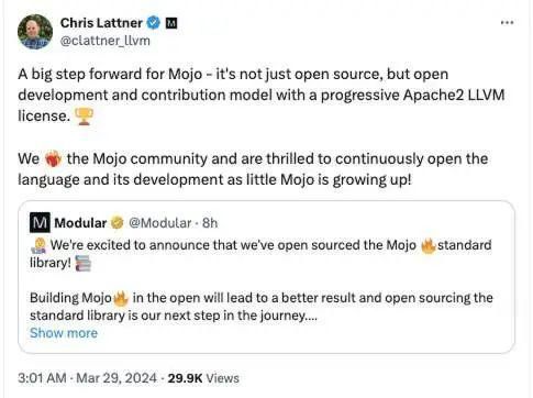 2024 年 3 月 29 日,Modular Inc. 宣布开源 Mojo 的核心组件。