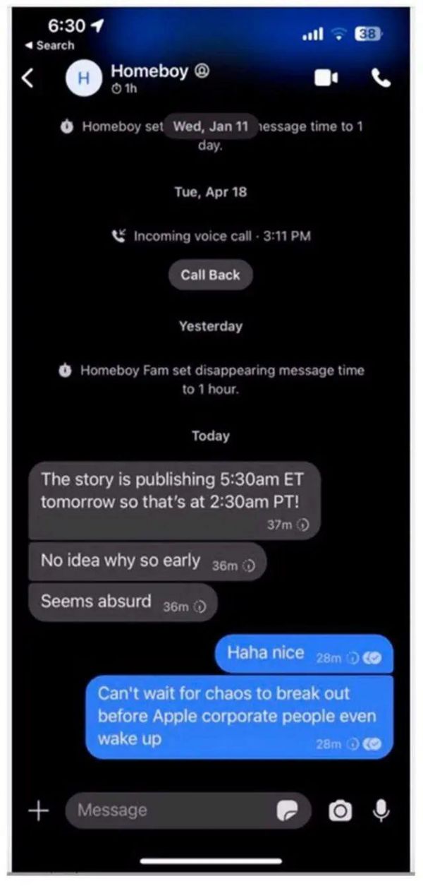 比如,在2023年4月,奥德通过电话向《华尔街日报》的一名记者泄露了 iPhone “手记” 应用的最终功能列表。此外,他还向一位名为“Homeboy”发送了超 1000 多条的泄密信息。