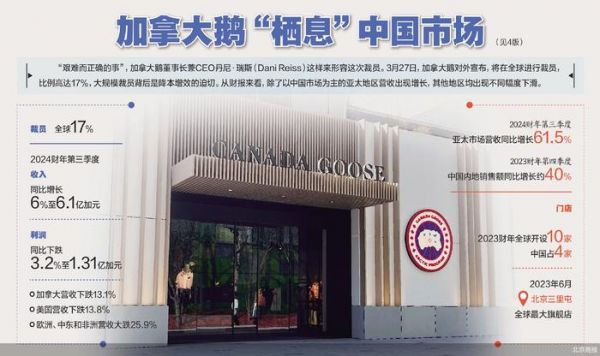 “艰难而正确的事”,加拿大鹅董事长兼CEO丹尼·瑞斯(Dani Reiss)这样来形容这次裁员。3月27日,加拿大鹅对外宣布,将在全球进行裁员,比例高达17%,大规模裁员背后是降本增效的迫切。从财报来看,除了以中国市场为主的亚太地区营收出现增长,其他地区均出现不同幅度下滑。基于这样的表现,加拿大鹅将发展重点放在中国市场,但中国市场不是只有一个玩家,随着国内外高端羽绒服品牌的布局,加拿大鹅不能只靠中国市场。