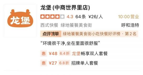 贾国龙在呼和浩特开出的第一家“龙堡”,人均价格为26元。(图/大众点评)