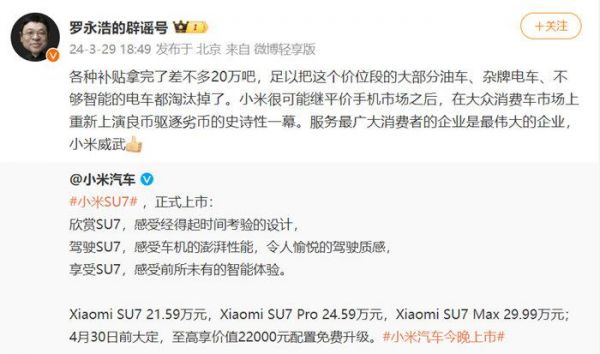 罗永浩称赞小米威武,看好小米SU7将上演良币驱逐劣币