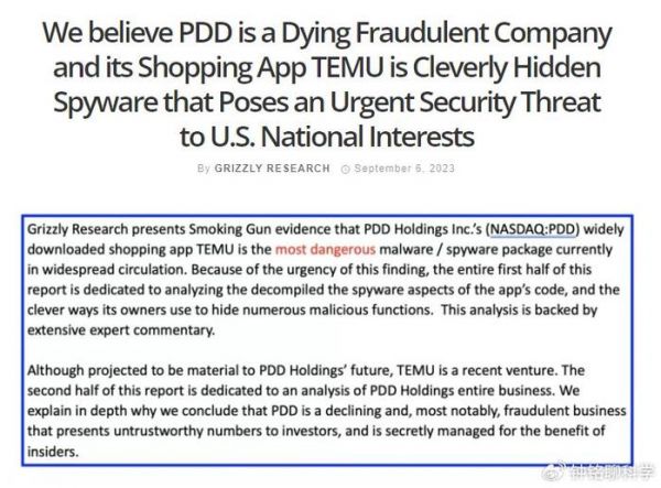 还有一家美国的做空机构发布了一篇长文,其中涵盖了各种捕风捉影和捏造的故事,中心意思就是Temu是一家诈骗公司,对美国国家利益构成安全威胁。