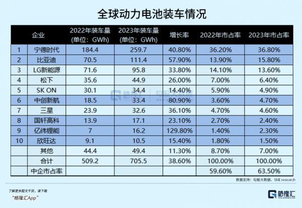 去年,全球动力电池前十大厂商中,中国企业占了六席,剩下四席为日韩企业包揽。而六家中国企业里,前二宁德时代、比亚迪,以及中创新航(第六)和亿纬锂能(第九)四家市占率显示出了提升。