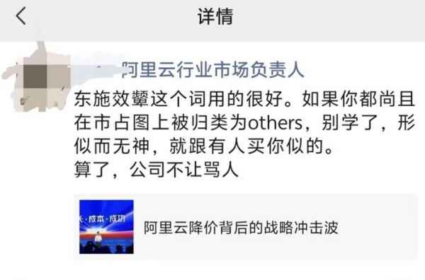 “东施效颦这个词用的很好。”近日,阿里云某负责人转发一篇文章时在朋友圈称:如果你都尚且在市占图上被归类为others,别学了,形似而无神,就跟你有人买你似的。