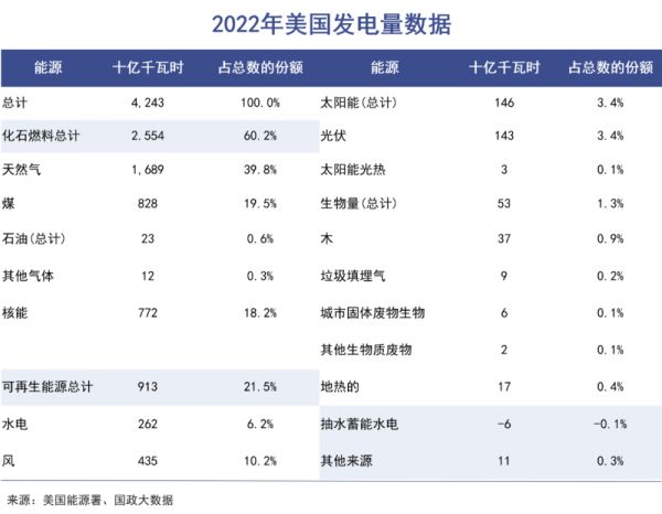 在《通胀削减法案》的刺激下,美国在新能源的道路上疾驰,煤电贡献度明显下降,风光等可再生能源逐渐成为主力军。2022年,美国煤电份额从23%减少到20%,核能从20%减少到18%。