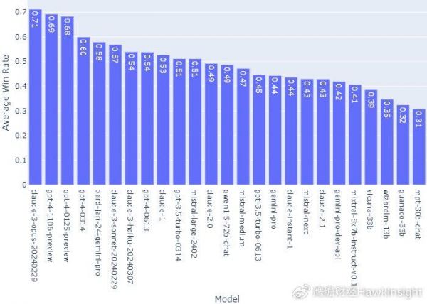 其中,在“对所有其他模型的平均胜率(假设抽样均匀且无平局)”一项上,Claude 3 Opus是唯一一个胜率过0.7的。