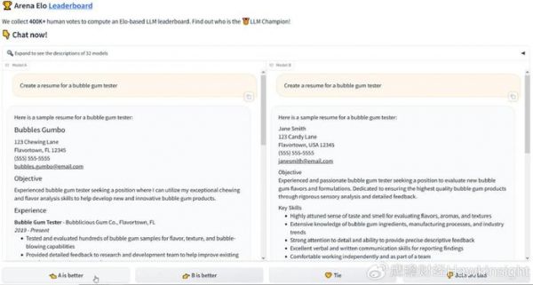 当有用户进行测试时,系统会要求用户在底部的提示框中输入问题。然后会有两个匿名模型驱动的聊天机器人来回答用户的问题,这两个模型被简单地标记为模型A和模型B。