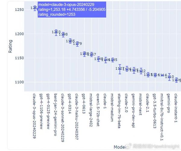 根据最新排行榜,Claude 3 Opus共获得33,250票,第二名GPT-4-1106-preview获得54,141票。但获得的评价多,不意味着更强。为了对LLM进行评级,排行榜采用的是Elo 排名系统,这是国际象棋等游戏中常用的一种方法,衡量玩家在某些比赛中与其他玩家相比的相对实力。在使用Elo 排名系统后,Claude 3 Opus在“模型强度的置信区间”上以总分1,253在最新的排名中斩获第一,险胜GPT-4-1106-preview的1,251分。