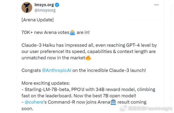 就连LMYSY Org官方也发文称:“Claude-3 Haiku给所有人留下了深刻的印象,甚至根据我们的用户偏好达到了 GPT-4级别!其速度、功能和上下文长度目前在市场上是无与伦比的。”
