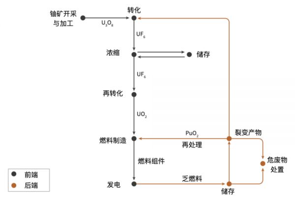 下图概括了核燃料循环,本报告仅涉及周期的前端,更具体地说是浓缩(enrichment)阶段。