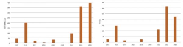 2015年~2023年法国从俄罗斯的浓缩铀进口统计