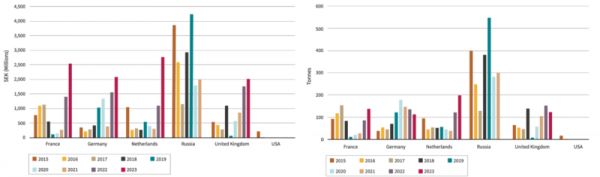 自2022年起,瑞典停止从俄罗斯进口浓缩铀,这一转变表明,所有依赖Västerås供给的核电企业已经成功地找到了替代供应商。在2022年和2023年,瑞典从法国、德国、荷兰和英国进口的浓缩铀价值显著增加,其中Orano和Urenco(英国、荷兰和德国财团)的交付量增长。