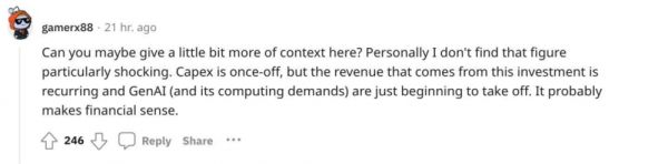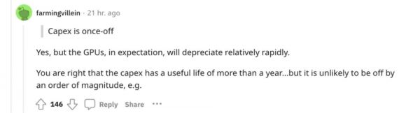但这种乐观的观点很快遭到反驳,另一位网友指出:“资本的支出的确是一次性的,但 GPU 会相对较快地贬值。”