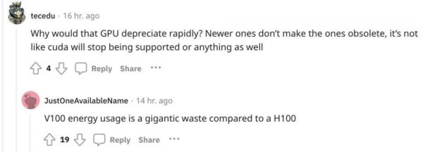 为什么说 GPU 会快速贬值呢?虽然较老版本的 GPU 也不会停止支持 CUDA(英伟达推出的运算平台)等等,但与 H100 相比,V100 的能源消耗是巨大的浪费。