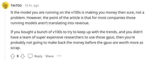 如果使用 V100 可以赚钱,那当然没问题。然而,如诸多媒体报道所述,对大多数公司来说,现阶段运行大模型并没有转化为实际收入。