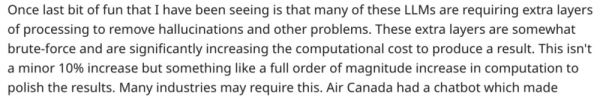 值得注意的是,许多 LLM 都需要额外的处理层来消除幻觉或解决其他问题。这些额外的层显著增加了生成式模型的计算成本。这不是 10% 的小幅增长,而是计算量增长了一个数量级。并且许多行业可能都需要这种改进。