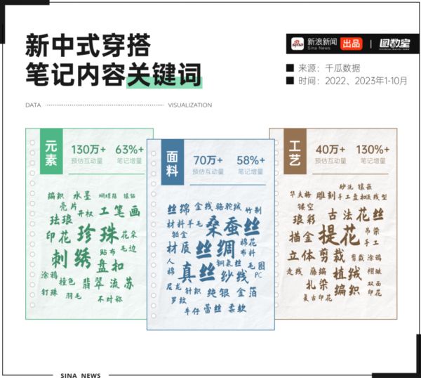 百搭、日常、轻便,中式服装从昂贵的华服,悄然进化成更符合现代生活的新中式穿搭。据飞瓜数据,2023年1月至10月,小红书的新中式相关种草笔记数较2022年同期增长110%+,月均笔记数过万,年互动总量超2000万。