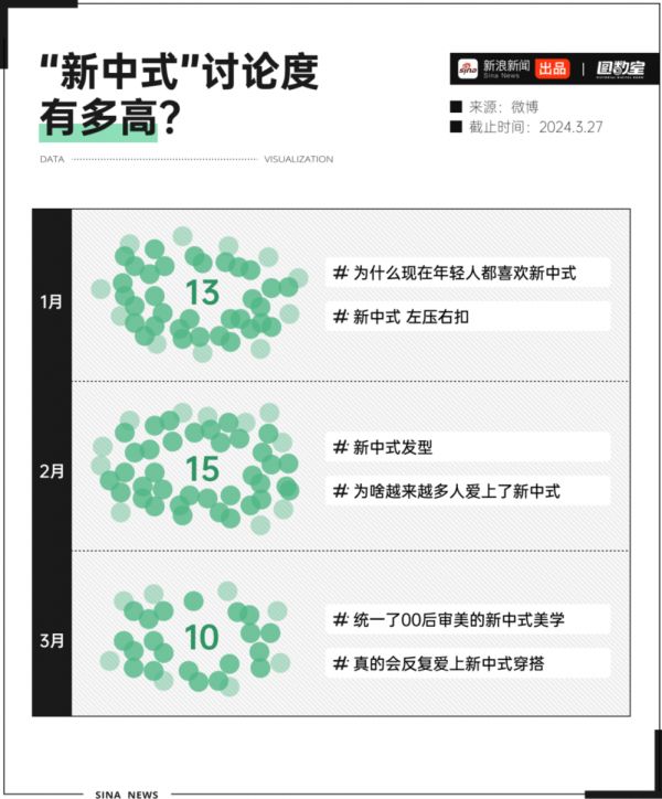 今年以来,微博上“新中式”相关的热搜共有38条,平均每个月有13条相关话题词登上热搜榜,话题阅读量最高近2亿。新中式大行其道的当下,穿新中式时装,化新中式妆、喝新中式茶饮,吃新中式汉堡,成为“潮人”们一种普遍的时尚表达。