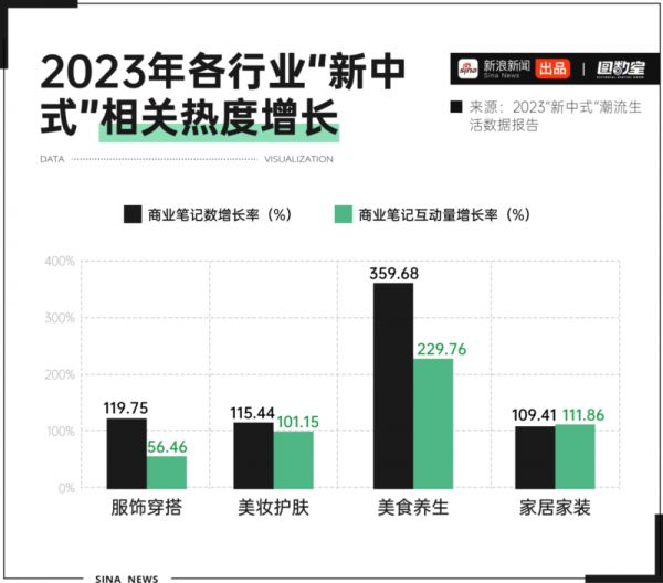 《2023“新中式”潮流生活数据报告》显示,2023年新中式整体热度飙升,各行业领域的商业笔记数量及互动量都有明显的增长。其中,美食养生领域商业笔记数同比增长率最多,达到359.68%,服饰穿搭、美妆护肤和家居家装行业也均实现100%及其以上的增长率。