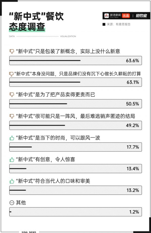拿餐饮举例,有机构做过调查,63.6%的人认为新中式只是包装了新概念,实际上没什么新意,63.1%的人和50.5%的人认为新中式品牌们想要赚快钱,或者想要把产品卖得更贵。