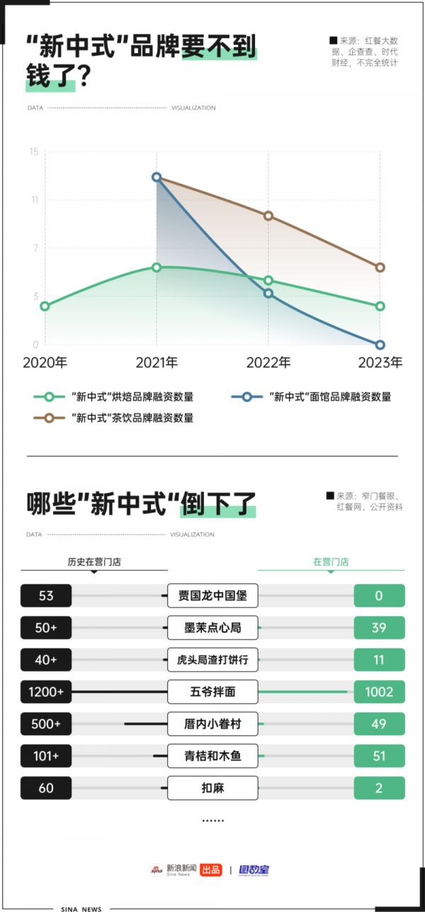一批“新中式”陷入了倒闭潮,虎头渣打饼行母公司破产、墨茉点心局退守长沙、贾国龙中国堡全线关停。投资者渐渐也不为新中式买单了。根据公开资料显示,“新中式”烘焙、茶饮、面馆等品牌融资数量逐渐变少。新中式的故事不再动人。