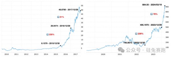 英伟达在上一个AI热潮中上涨了5倍,在这一波AI周期中,股价几乎像素级复刻了上一波的走势。