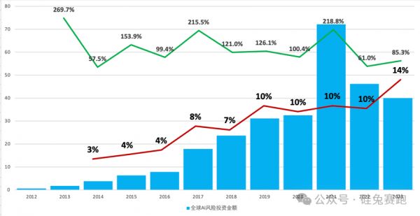 柱状图是全球AI的风险投资金额,绿色的线是投资增速,红色的线是AI在全球投资中的占比。