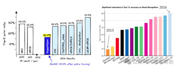 直到2012年的ImageNet挑战赛,Hinton 带着得意门生 Alex 和 Ilya 用 AlexNet 碾压里其他参赛者,树立出了当时深度学习(大量数据+可规模化的算法+GPU计算)的范式,成为了后续多年的研发基石。到2015年ResNet出现,实现首次AI在图像分类任务中对人类平均水平的超越。