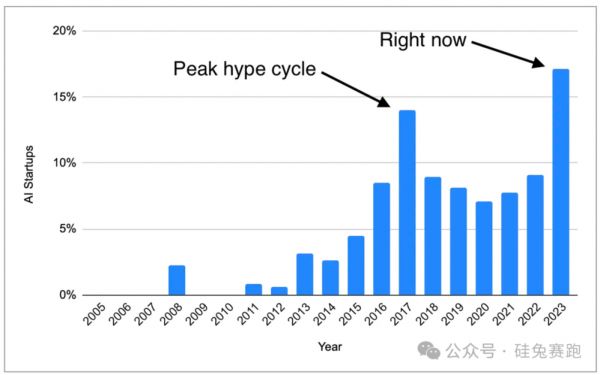 不过有一个明显有差异的地方,第一张图显示,2022年YC AI项目占比是超过2017年的,第二张图显示2022年AI项目占比则是低于2017年的。