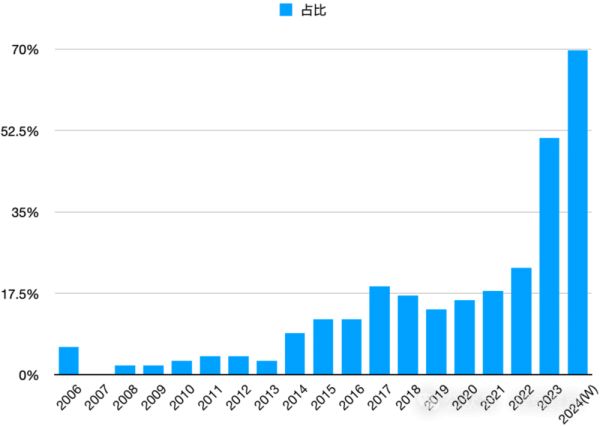 超过的图是我们2024年统计的,低于的图是YC校友基金Rebel Fund 2023年初统计的,说明这一年多时间,YC 22年大约有10%的项目转型做AI了。