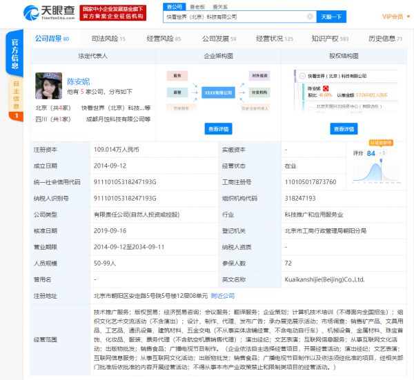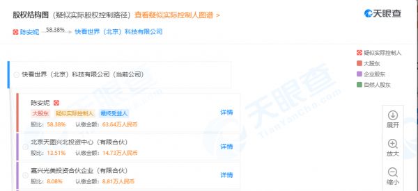 天眼查数据显示,快看漫画的运营主体快看世界(北京)科技有限公司成立于2014年9月,注册资本约109万人民币,法定代表人为快看漫画创始人陈安妮。同时,陈安妮也是快看漫画的最大股东,持股比例58.38%。