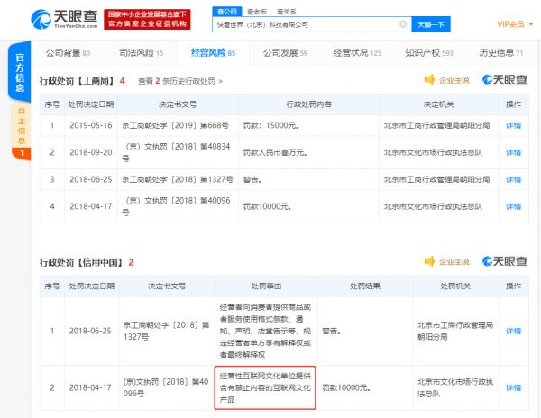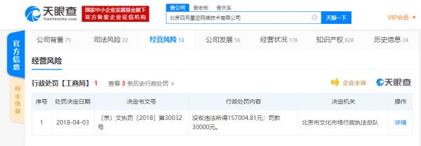 而在2018年4月,有妖气因经营性互联网文化单位提供含有禁止内容的互联网文化产品被北京市文化市场行政执法总队没收违法所得157004.81元,罚款30000元。2015年11月,其也曾因为上述原因被罚款1万元。