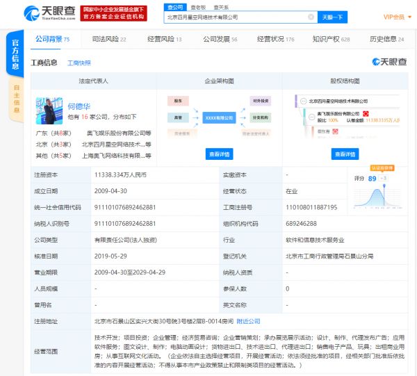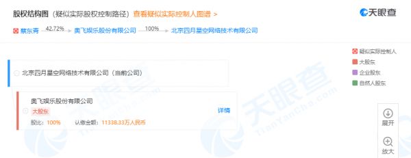同时被处罚的还有“有妖气”的运营主体——北京四月星空网络技术有限公司,其成立于2009年4月,注册资本约1.1亿人民币,为A股上市公司奥飞娱乐股份有限公司的全资子公司,法定代表人为奥飞娱乐总裁何德华。