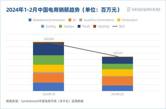 据Sandalwood线上监测数据显示,今年1月与2月各电商平台GMV表现不一,单从具体平台占比结构可知,淘宝&天猫的总量仍与身后各家拉开相当大的距离。