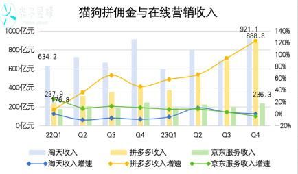 截至第四季度,淘天客户管理收入921.3亿元,与2022年同期基本持平。而拼多多对应收入为888.8亿元,同比增长123%。2022年第四季度,拼多多这部分的收入仅为淘天客户管理收入的44%,猫拼相差515亿元,一年之后双方仅存在33亿元的收入差距。