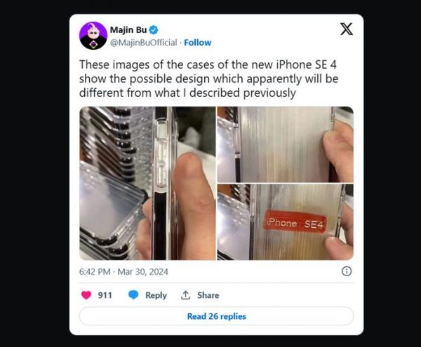 On the back of the device, we can see that the SE 4 will feature a single camera coupled with a flash and microphone. While the sensor is larger than its predecessor, the device resembles the iPhone XR, as the company reserves additional camera sensors for the premium models. However, there does not appear to be a camera plateau on the device, as the camera bump protrudes from the back glass itself.